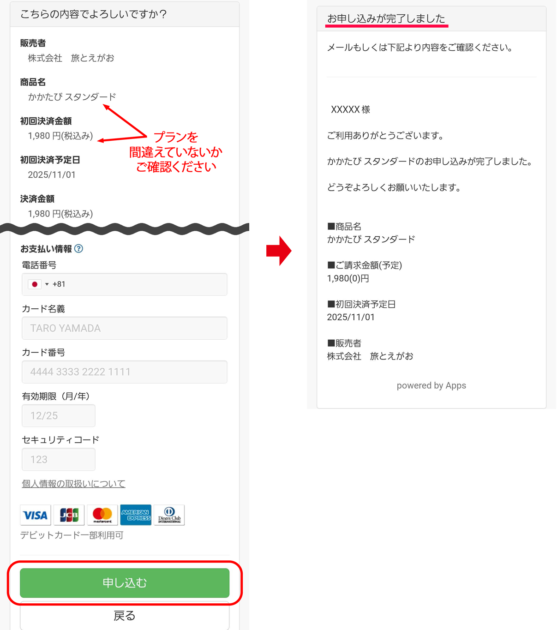 プラン内容をご確認のうえ、カード情報を入力し、「申し込む」ボタンを押してください。