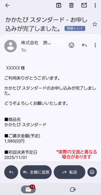 入力されたメールアドレス宛に、申込完了メールが届きます。